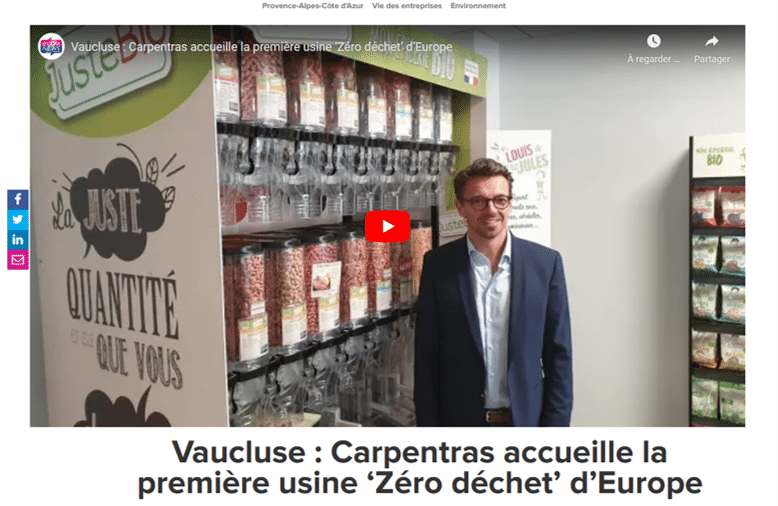 JusteBio, leader européen du vrac bio, inaugure sa nouvelle unité de production à Carpentras. Un investissement à hauteur de 16 millions d’€ pour son fondateur Franck Bonfils qui s’offre un site unique puisqu’il s’agit de la première usine d’Europe zéro déchet.