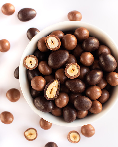 We offer, for example, products developed in-house, such as our 7 dried fruit mixes and many "homemade" flavorings: curry cashews, Provence herbs cashews or tomato and basil cashews. Not to mention our gourmet products made artisanally with the same recipe for 20 years: chouchous, caramelized almonds and caramelized hazelnuts. Or our dark chocolate coated almonds or milk chocolate coated hazelnuts, delicious treats to snack on at any time of the day...