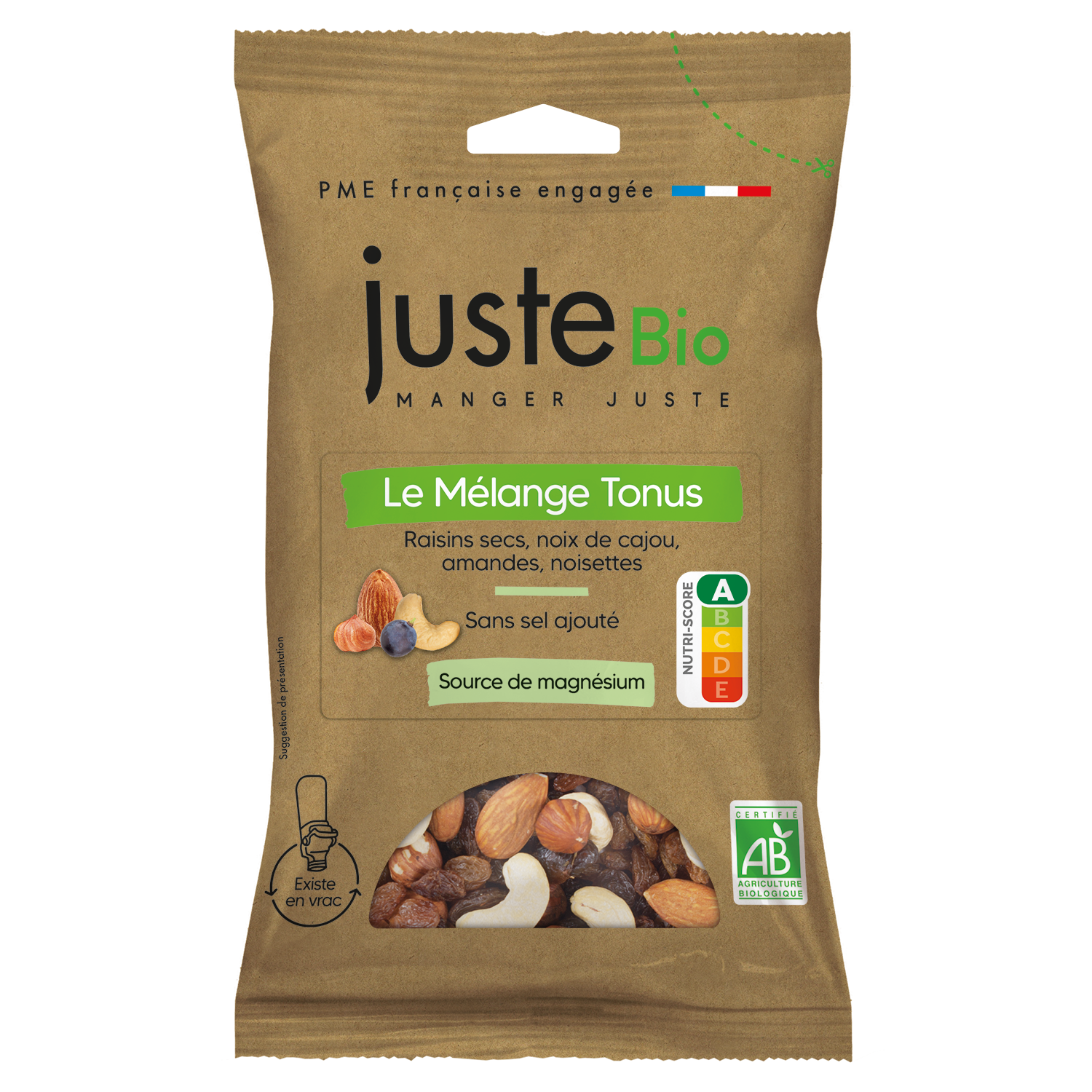 At the heart of this range, find for example our energy mix, an iconic mix that perfectly combines the crunchiness of almonds and hazelnuts, the sweetness of cashews and the slight acidity of raisins. A delicate and subtle mix, a source of magnesium that helps reduce fatigue. Note that this mix, with no added salt, no added sugar and no added oil, has a Nutriscore A.